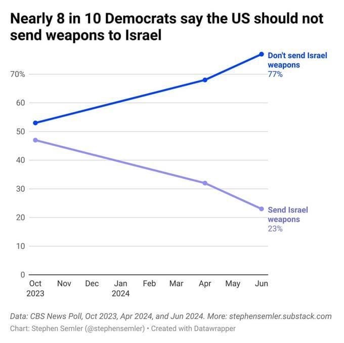 I say, them instead of us because it’s become obvious that as the party leadership has tacked to the right, the gap between them and the Democratic base has widened, not just over its support for the Israeli genocide in Gaza but over other issues as well (eg., immigration and the border wall, national healthcare, and more).